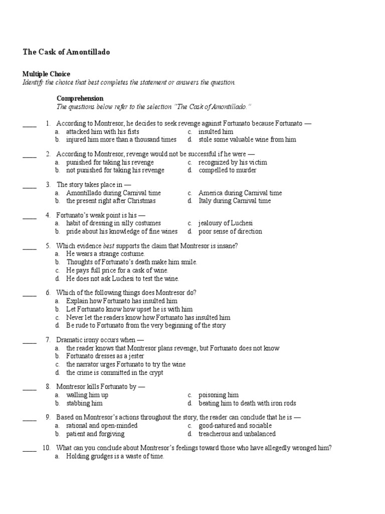 TEACHING WORDS AND PHRASES QUESTIONS FOR THE CASK OF AMONTILLADO. Read the following questions and circle the best answer. 12 days ago Rating.